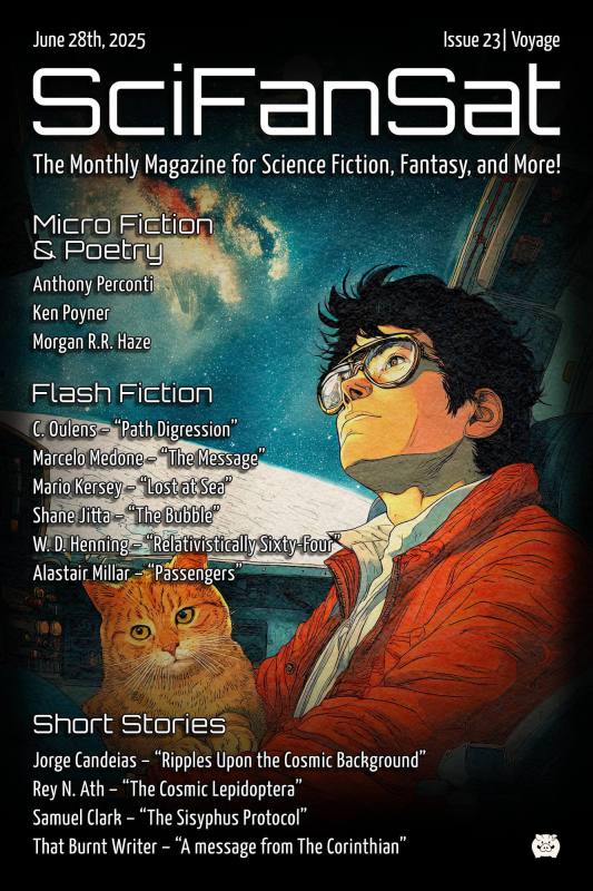 My flash science fiction story ‘Passengers’ appeared today in excellent company, in this month’s SciFanSat Magazine (the ‘Voyage’ issue). Enjoy!